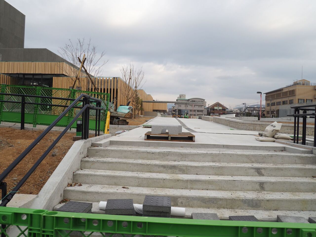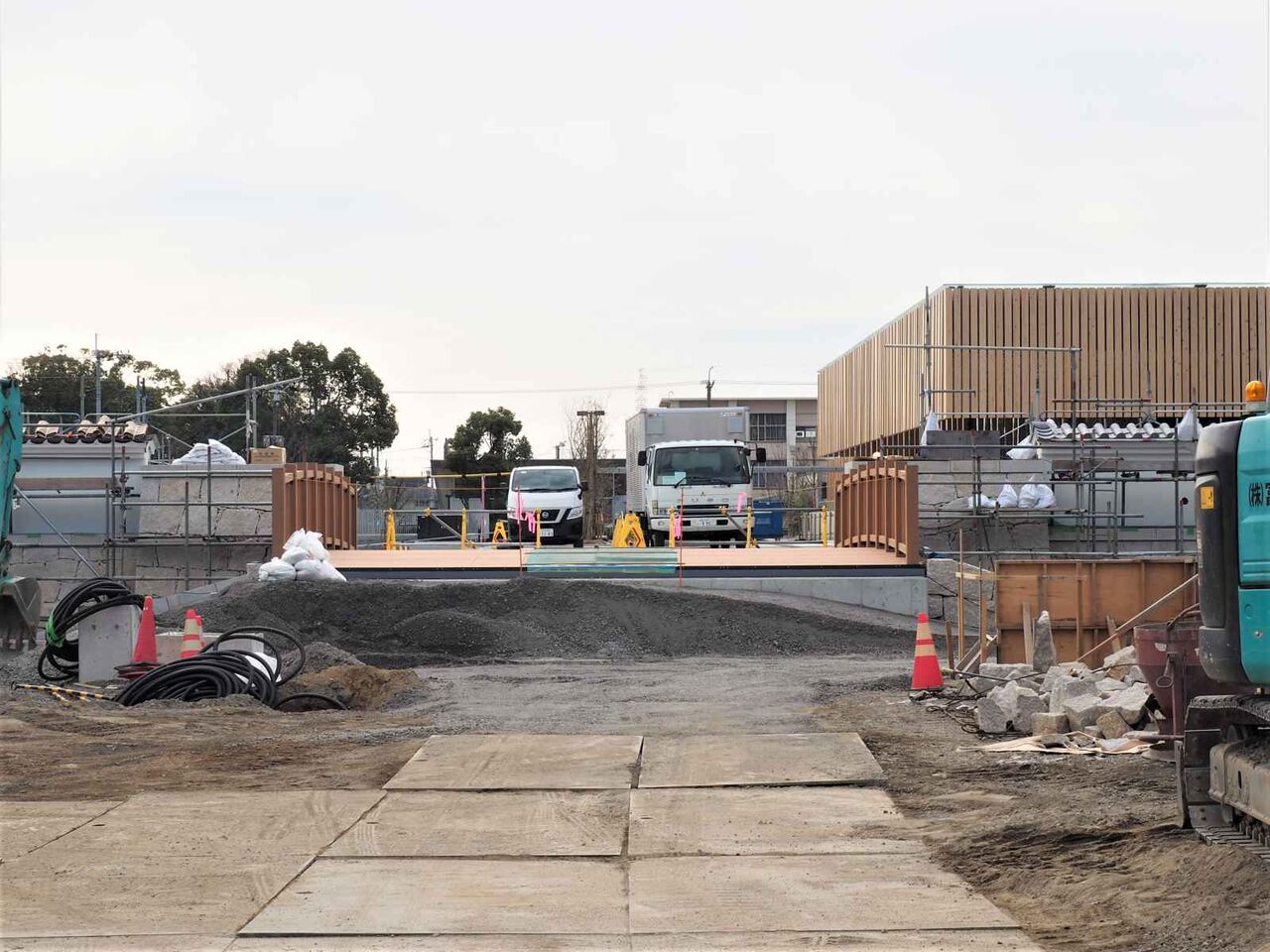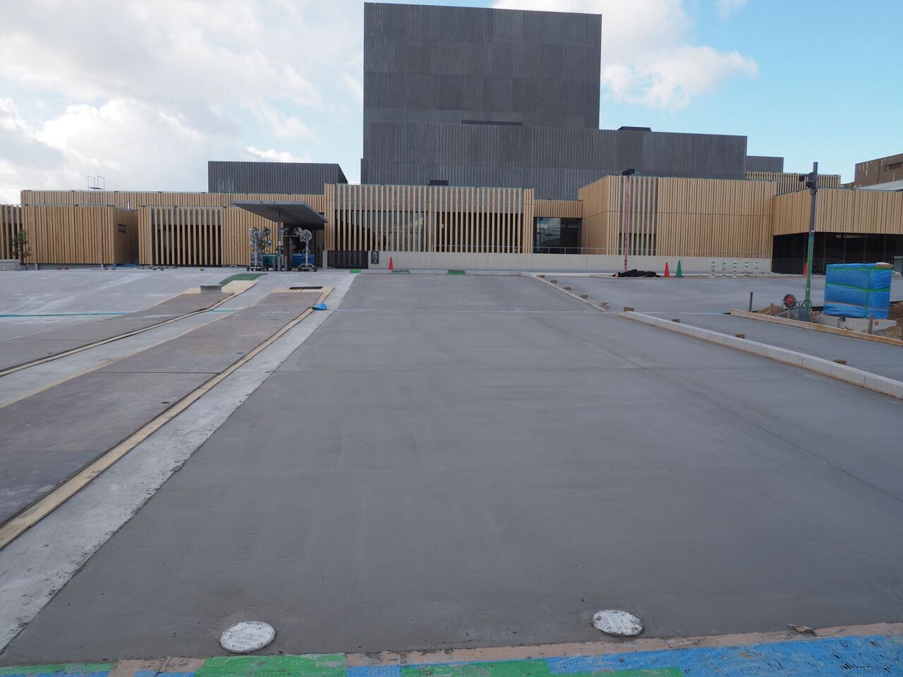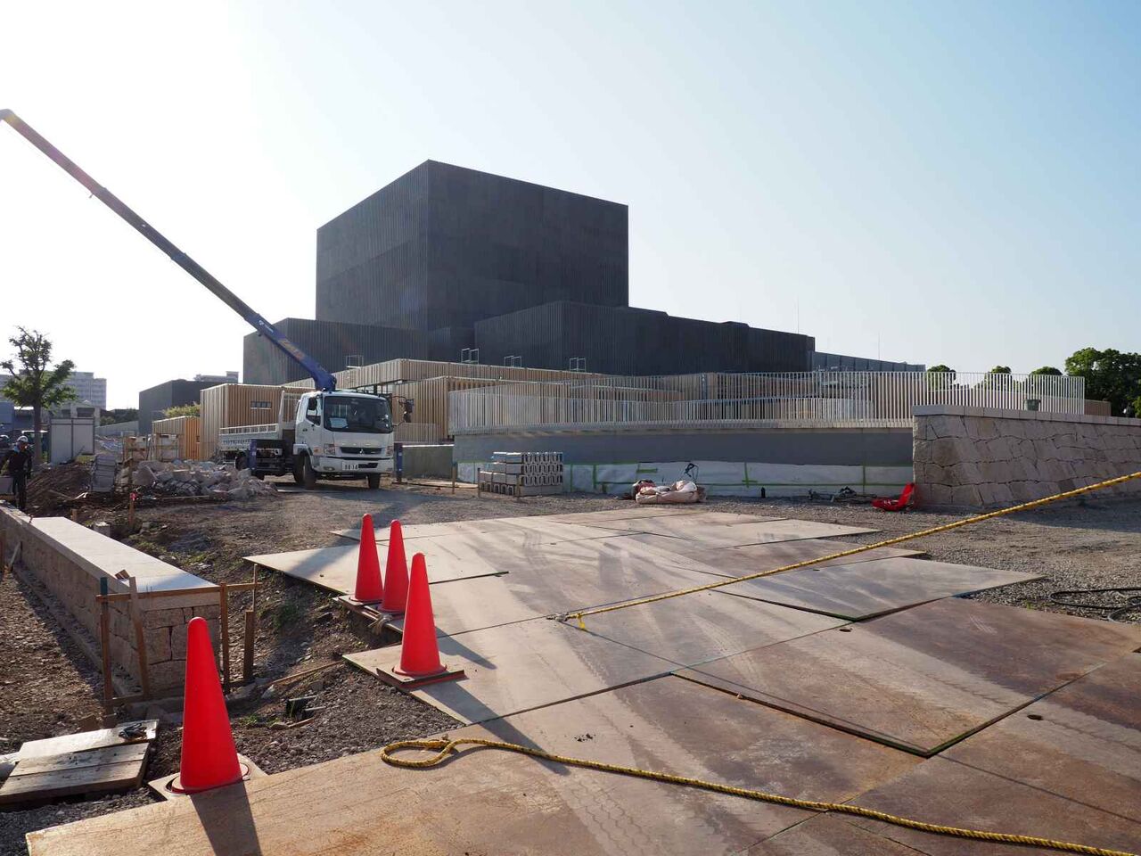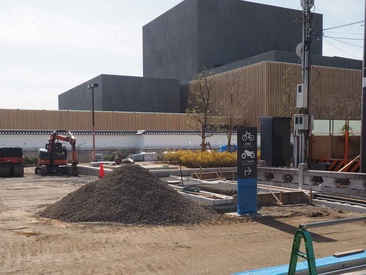 写真は21日時点のようすです。まだ正面の広場は舗装されていませんが、いよいよ完成真近です。