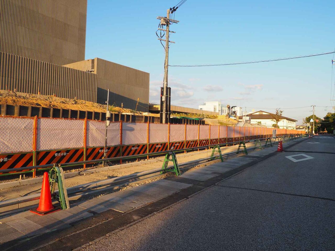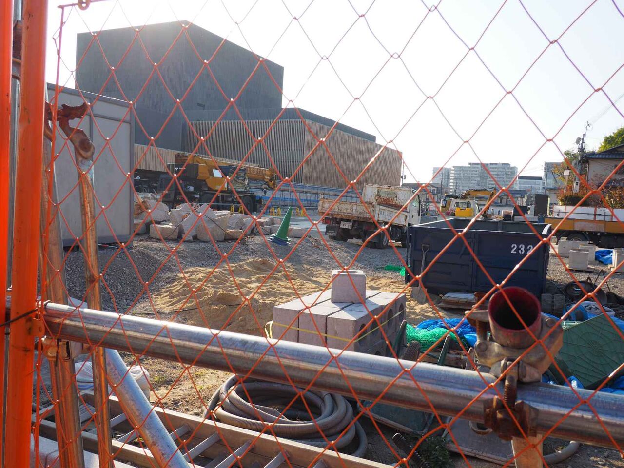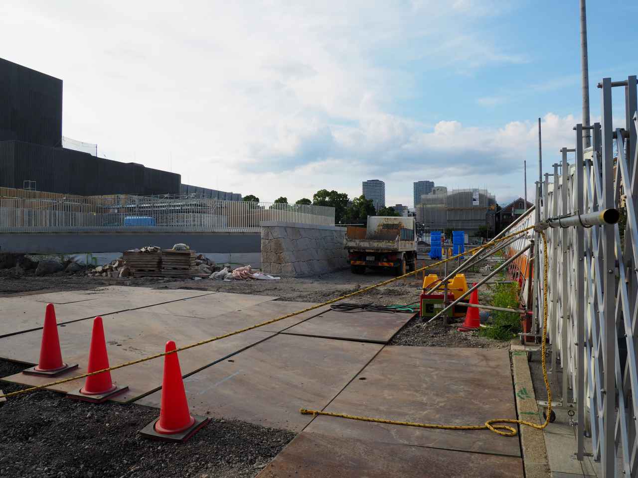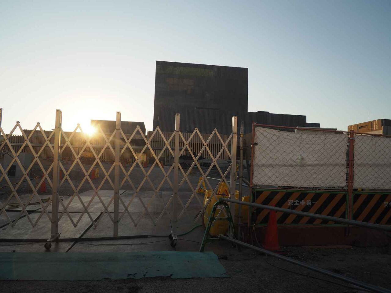 基礎の杭を打つのと、コンクリートをつくるサイトのようなものがあります。現地の周囲は塀に囲われてしまいました。