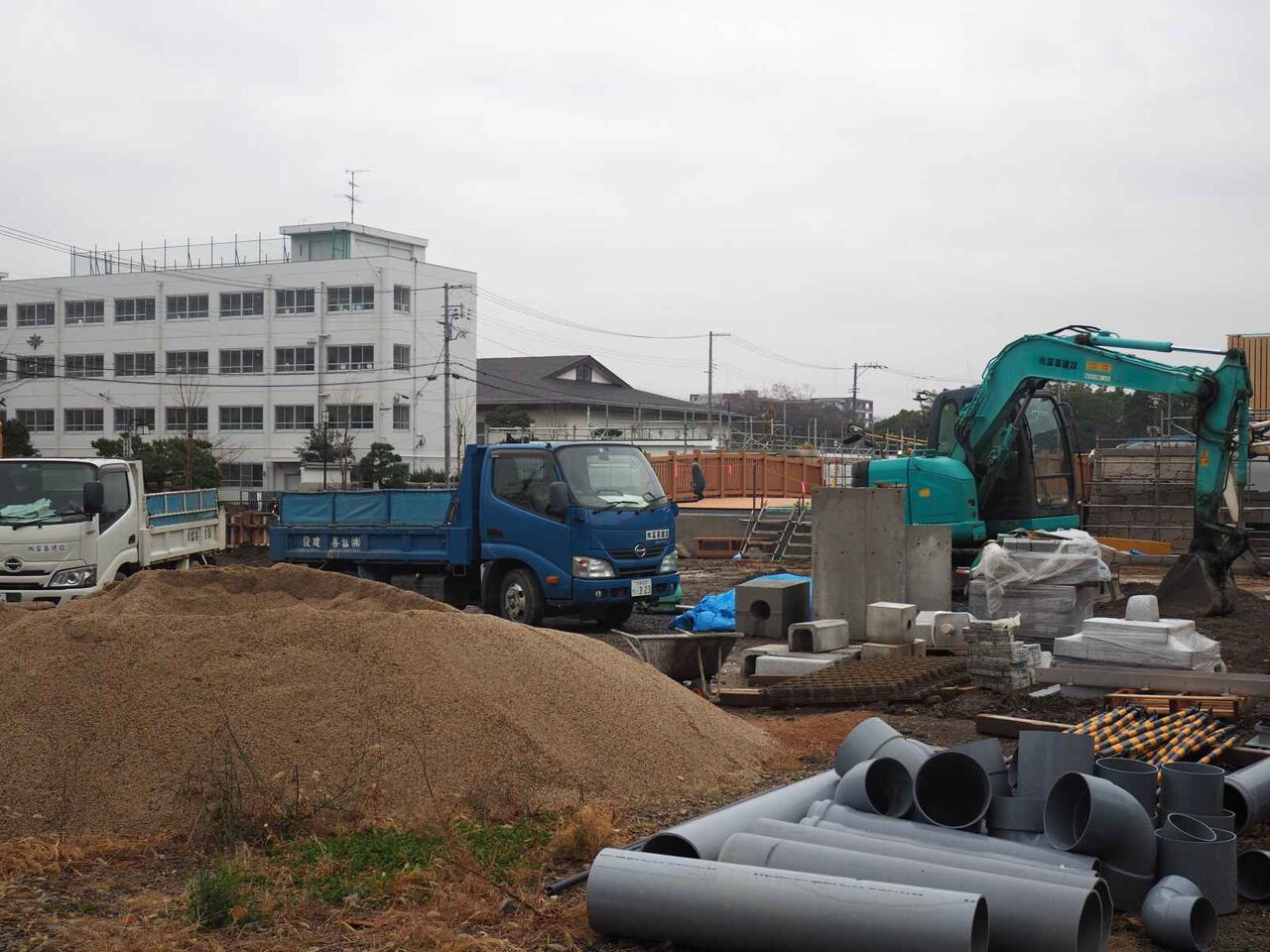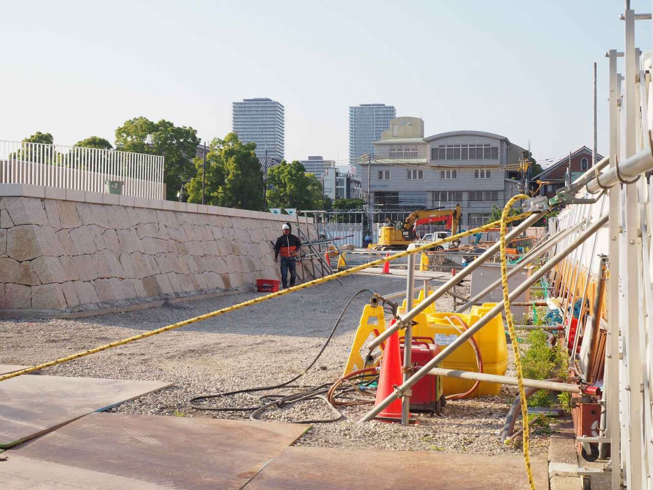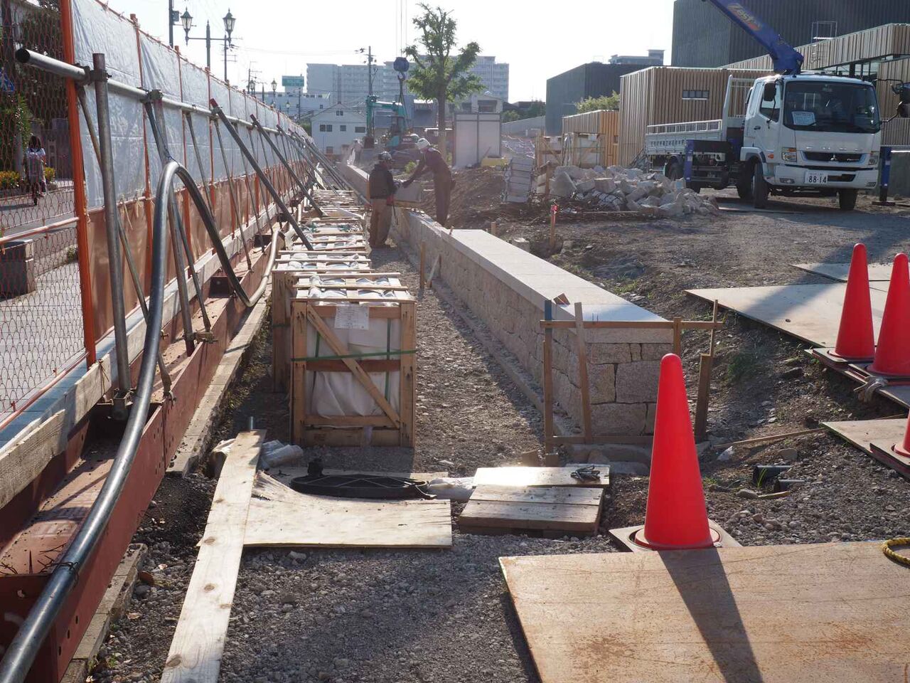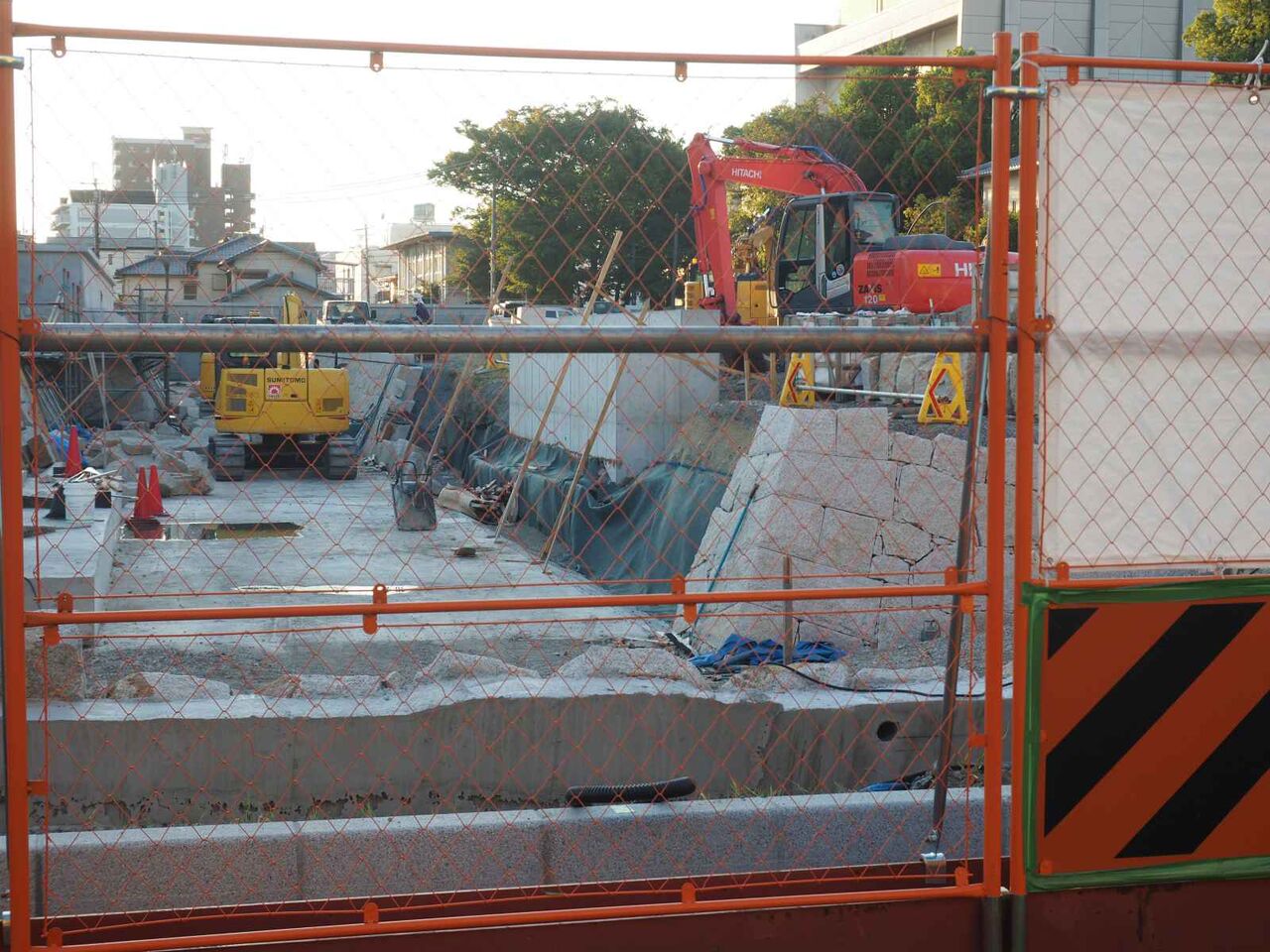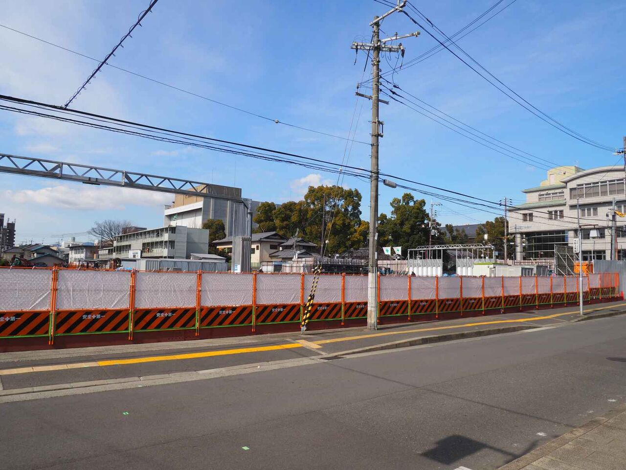 基礎の杭を打つのと、コンクリートをつくるサイトのようなものがあります。現地の周囲は塀に囲われてしまいました。