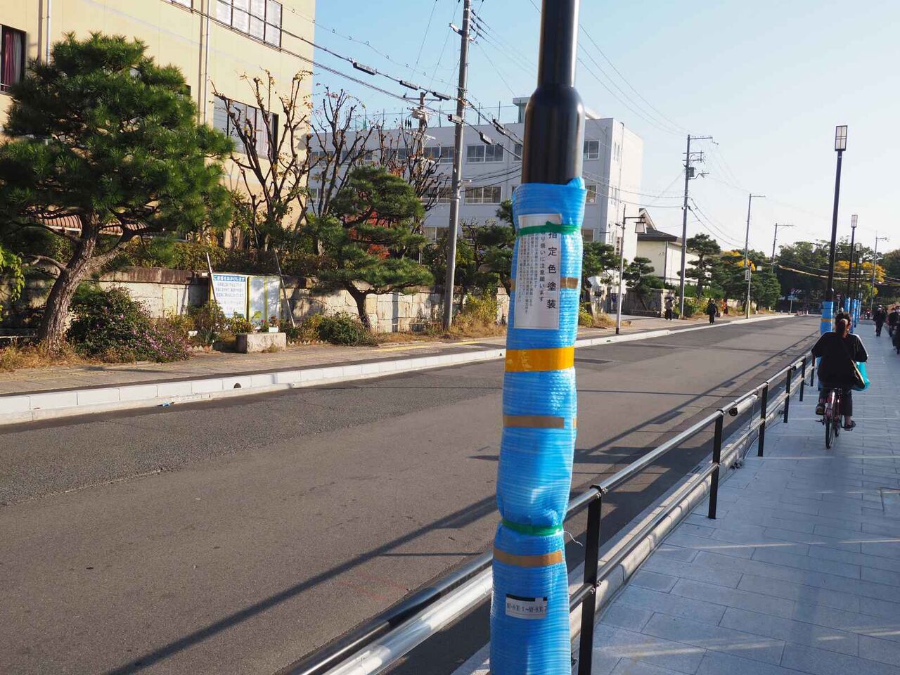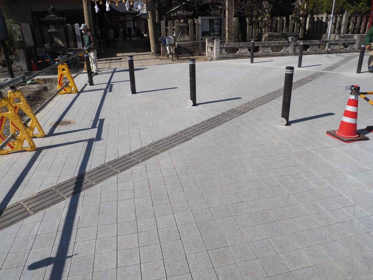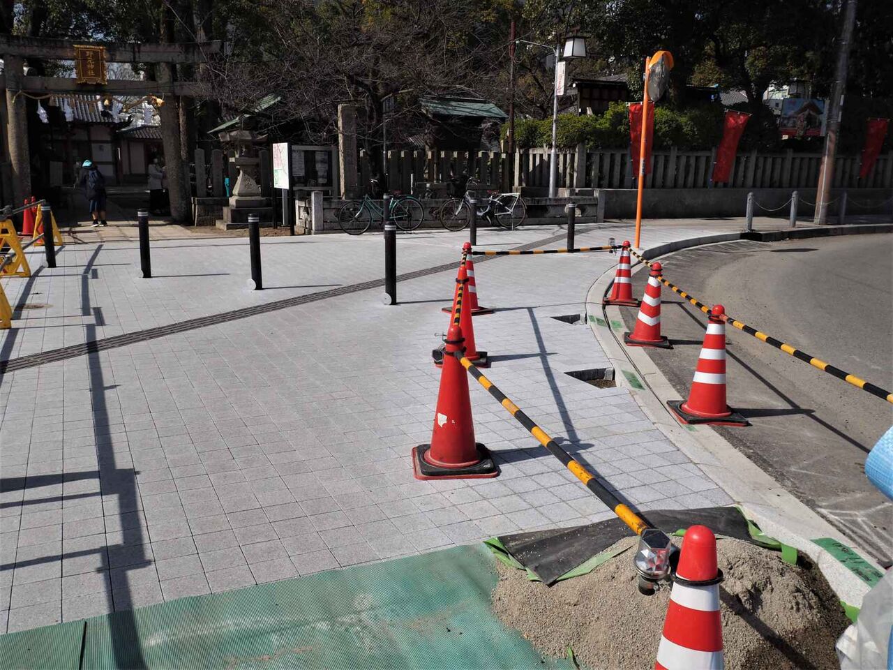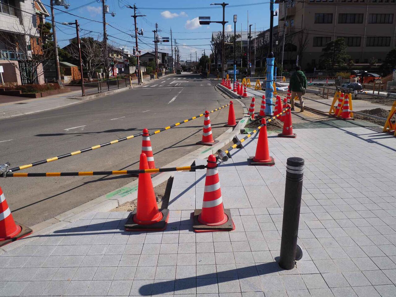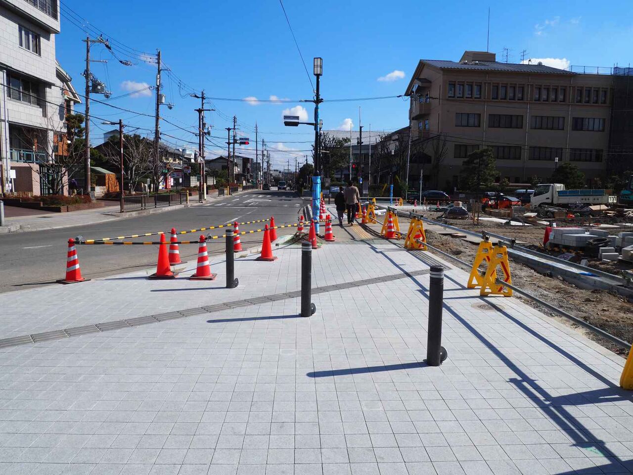 歩道のタイルが貼りなおされてるようです。正方形のブロックが敷き詰められています。