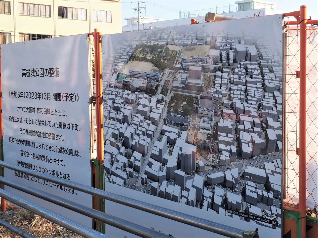 これは高槻城公園の入口付近から見たようすです。上の3枚は違う日に撮っているので微妙に進捗が違うかもしれません。今後も外観だけですが時々進捗追記します。。