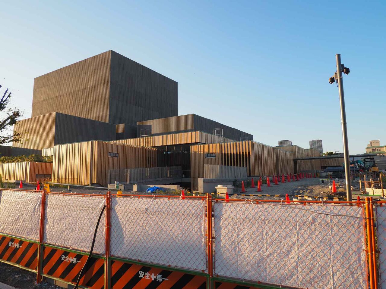 高槻芸術文化劇場の工事のようす 引き続き周囲の外構などの工事中ですが、北東のフェンスが簡素になり全体像がよく見えるようになってきました。(2022年6月)9月にはプレイベントがあるようです。