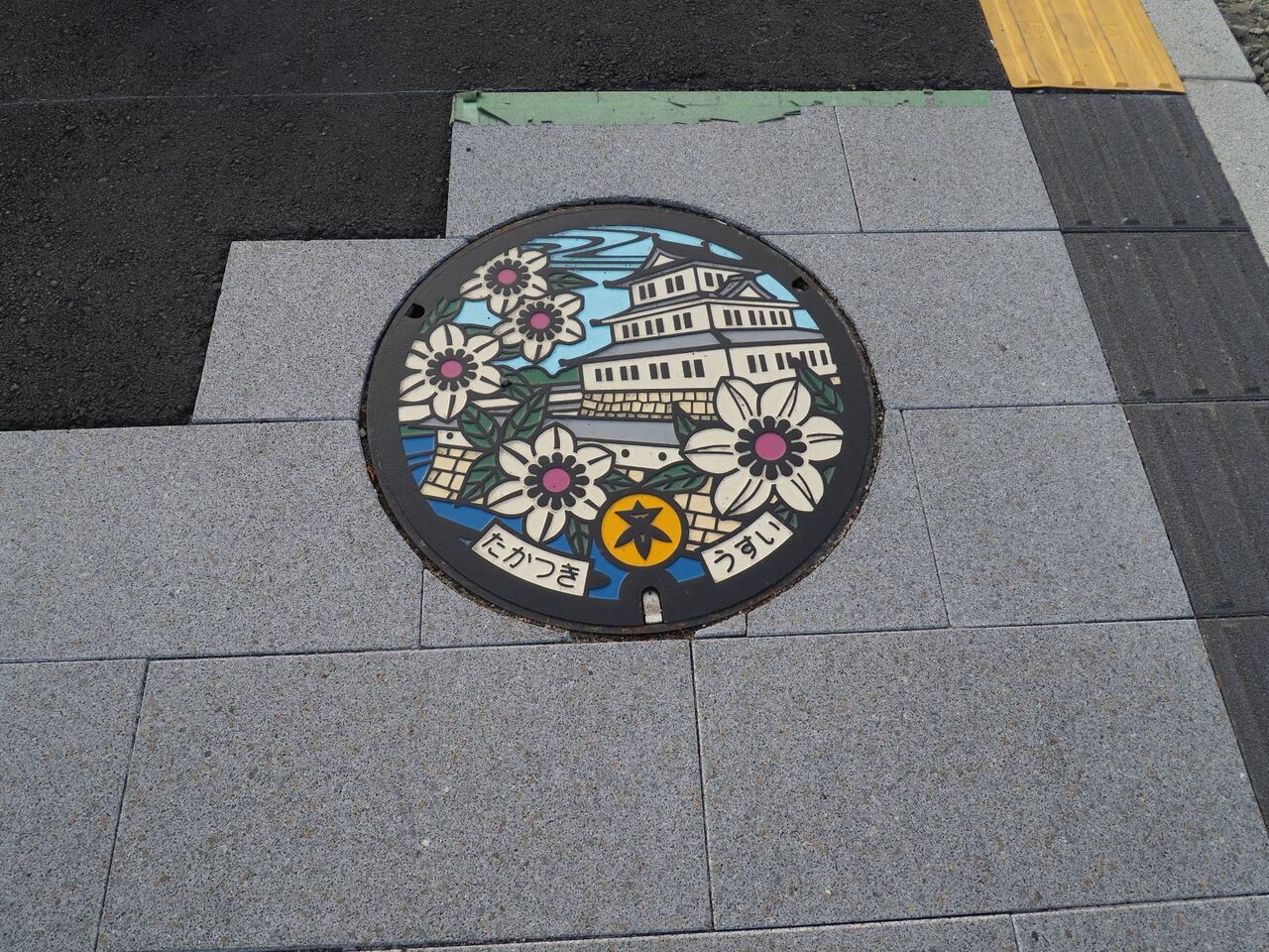 高槻城の雨水のカラーマンホールがありました。