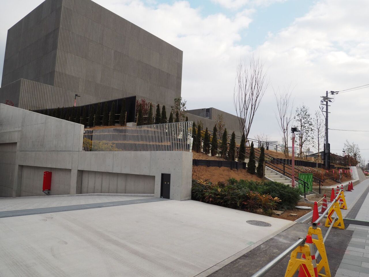 高槻芸術文化劇場の工事のようすです。外観のようすは完成していますが、周囲の工事がかなりできてきたようです。