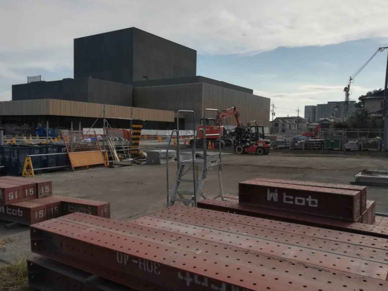 高槻芸術文化劇場の工事のようすです。11月になって先週、ついに外観が現れました。外に囲ってあった足場がなくなりました。20日時点、表はまだ少し残っていますが、南側や西側の足場はなくなっているようです。