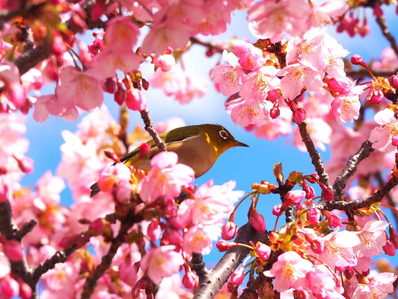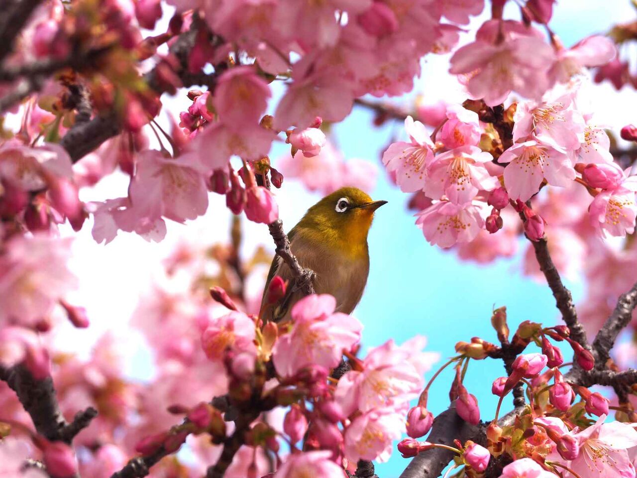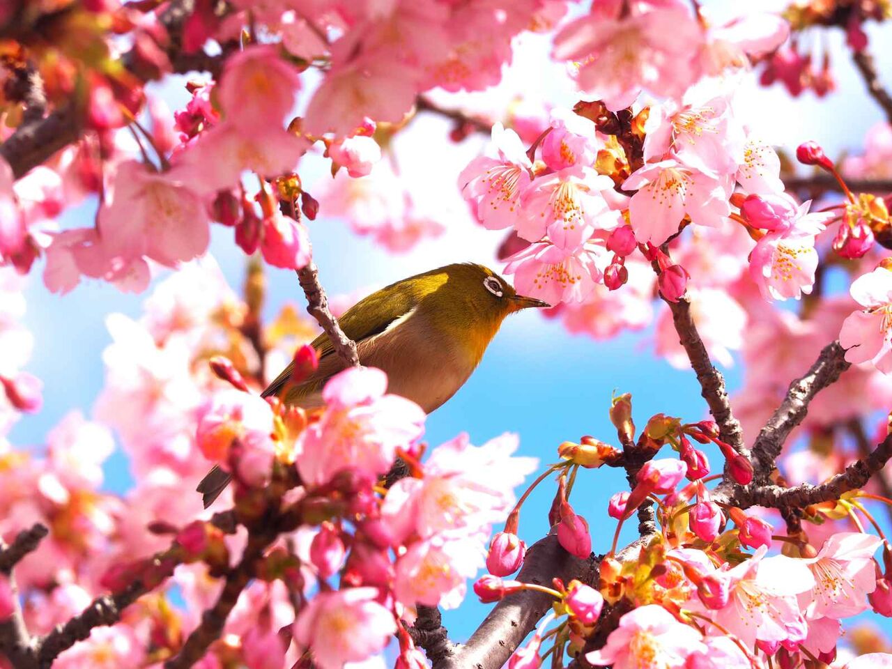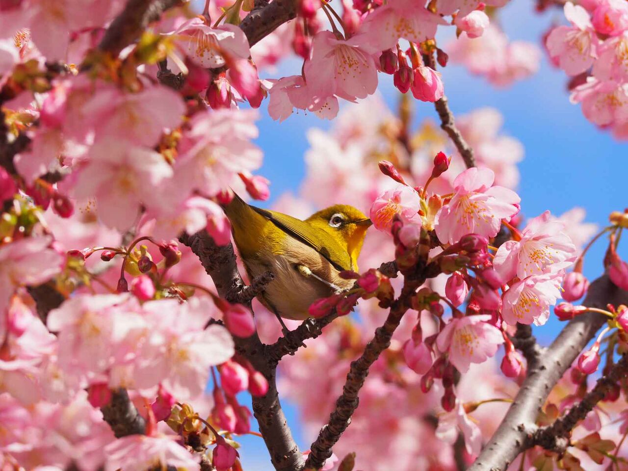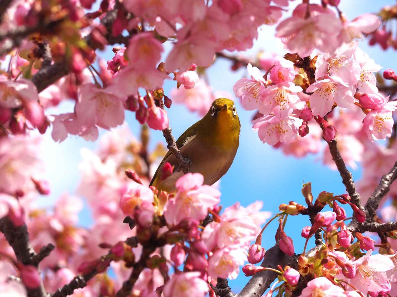 河津桜のようすを見ていますとメジロくんがやってきました。