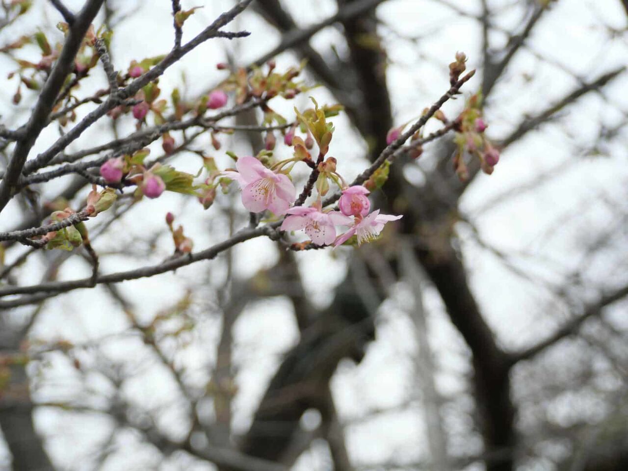 高槻の河津桜、筒井池公園の河津桜のようすを見てきました。前回から1週間後になりますが、暖かい日があったせいか、わずかに開花していました。(2022年3月6日時点)