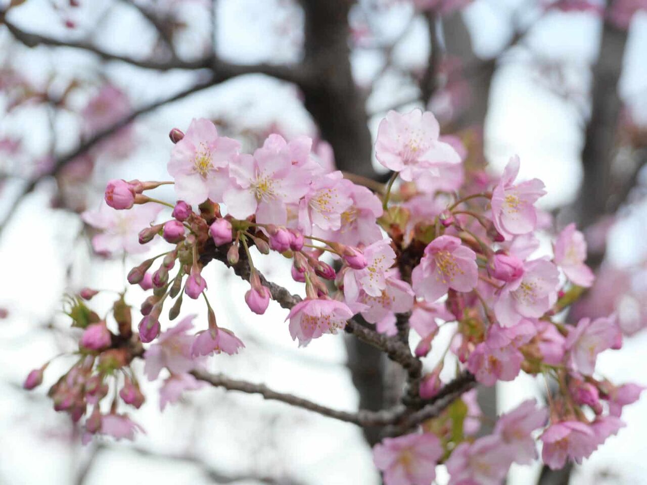 ▶高槻の河津桜 筒井池公園の河津桜のようす 開花してる 2021年3月6日時点