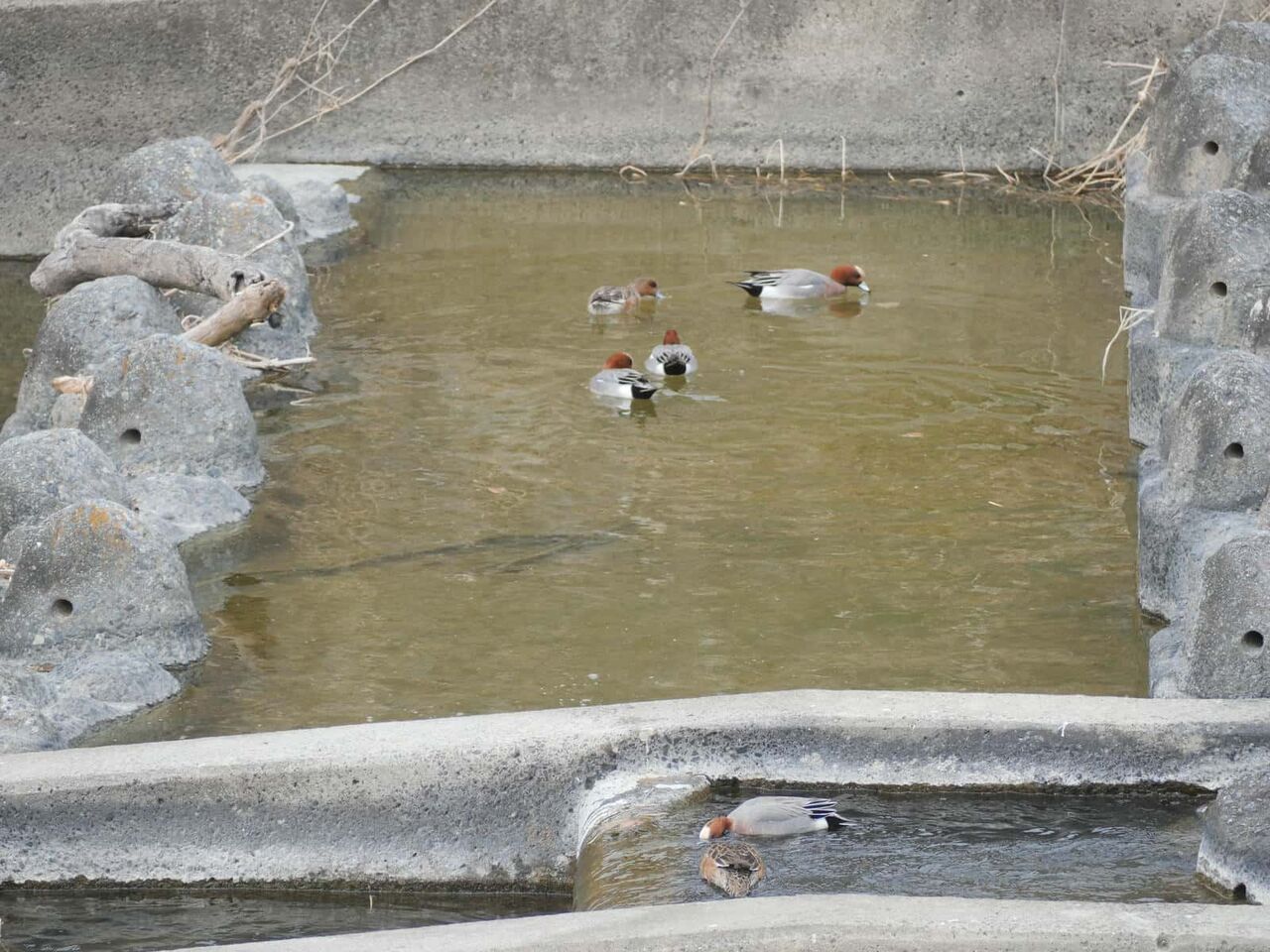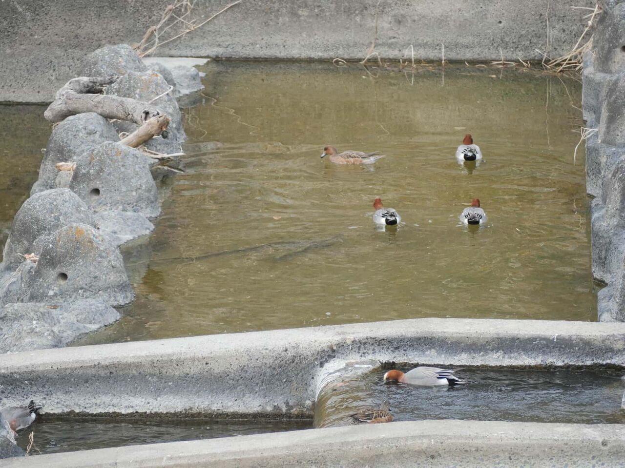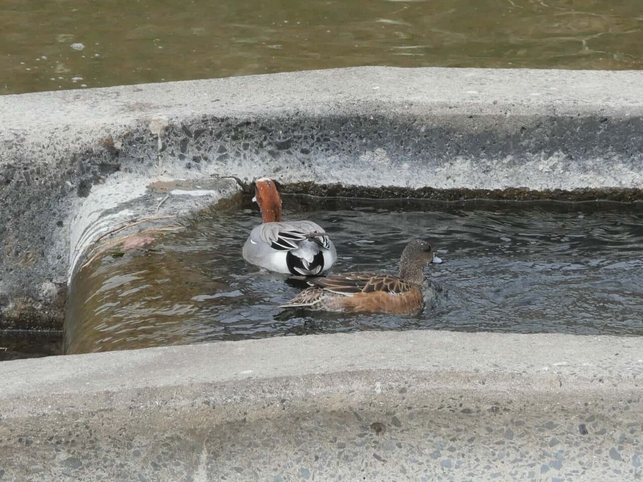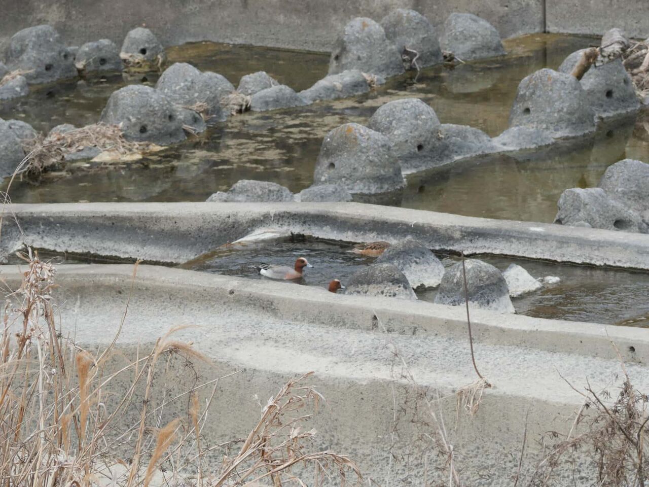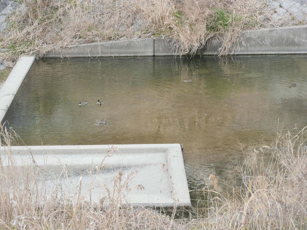 カモくんたちもちょっと大変です。ひなたぼっこは水路の中央にある仕切りの壁か、水路のり面で。