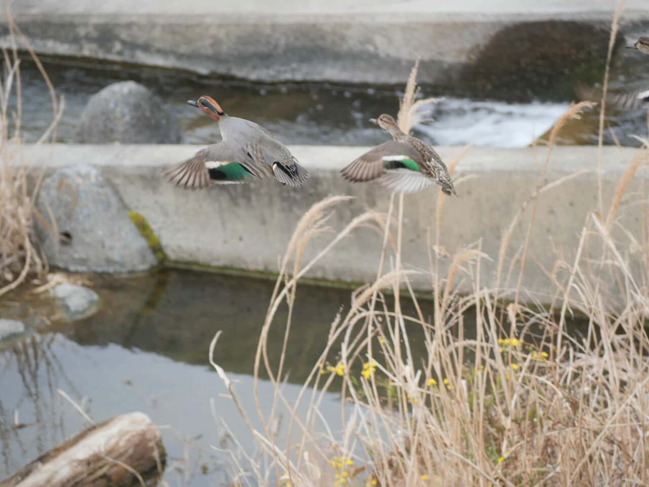 手前のしげみにいたコガモクンたちが一斉に飛び立ちました。(左がオス)