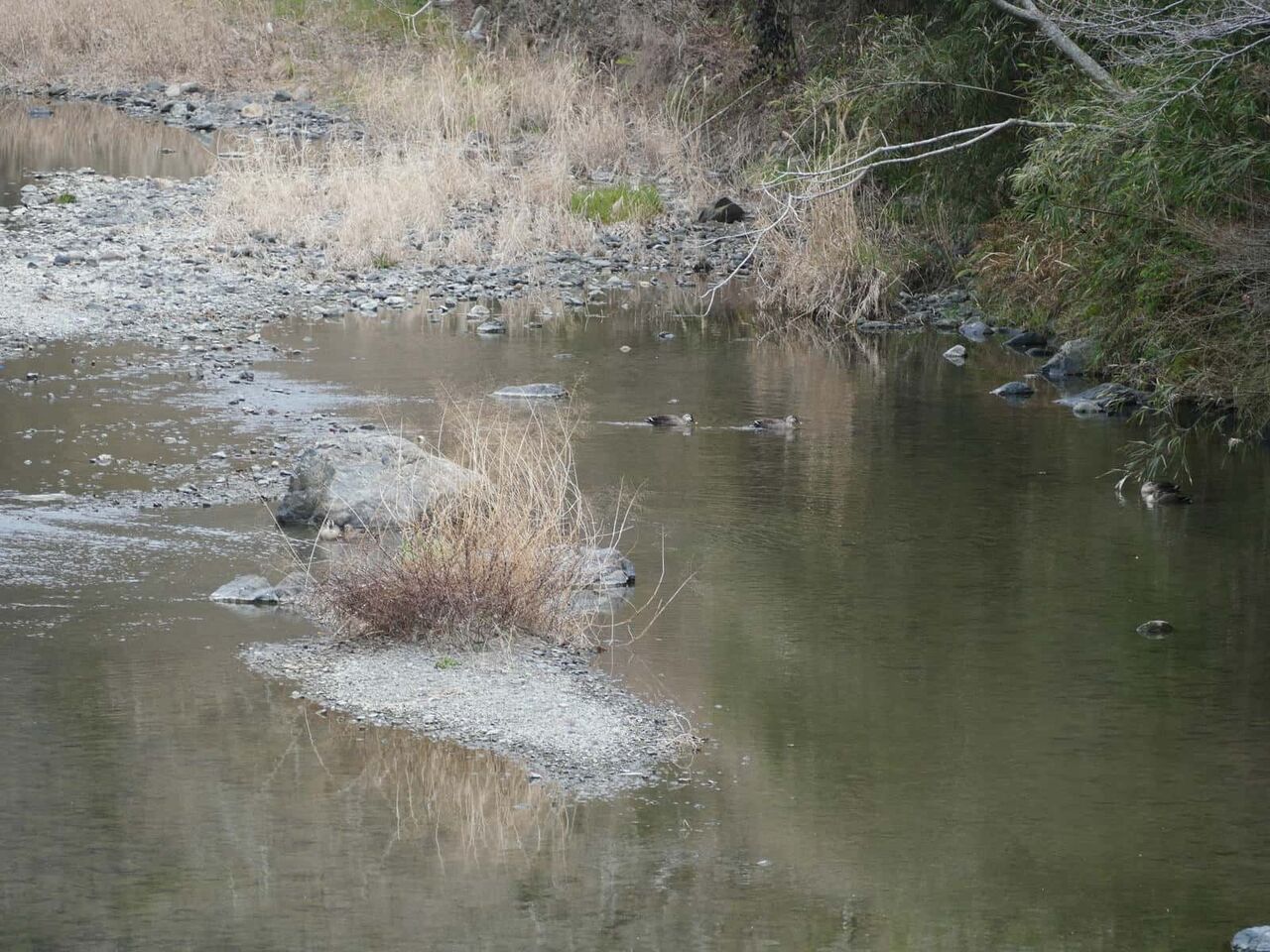 堤防から見るとこのようなようす。合わせるとかなりの数のカモ君たちが帰っているのではないでしょうか。