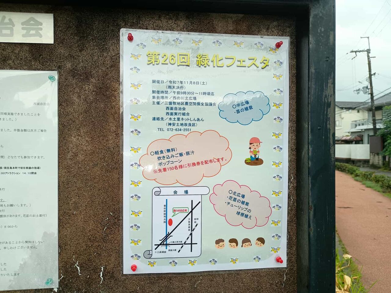 内容:輪投げ、軽食(豚汁・おにぎり・ポップコーン)と花の苗の無料配布(いずれも先着280名)、緑道清掃、西面消防団による消火訓練