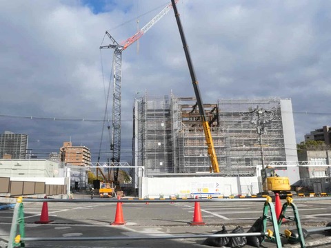 高槻警察の移転工事のようす 建物の最上階の組み立てが進んでいる 2025年2月3日時点