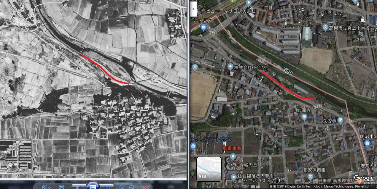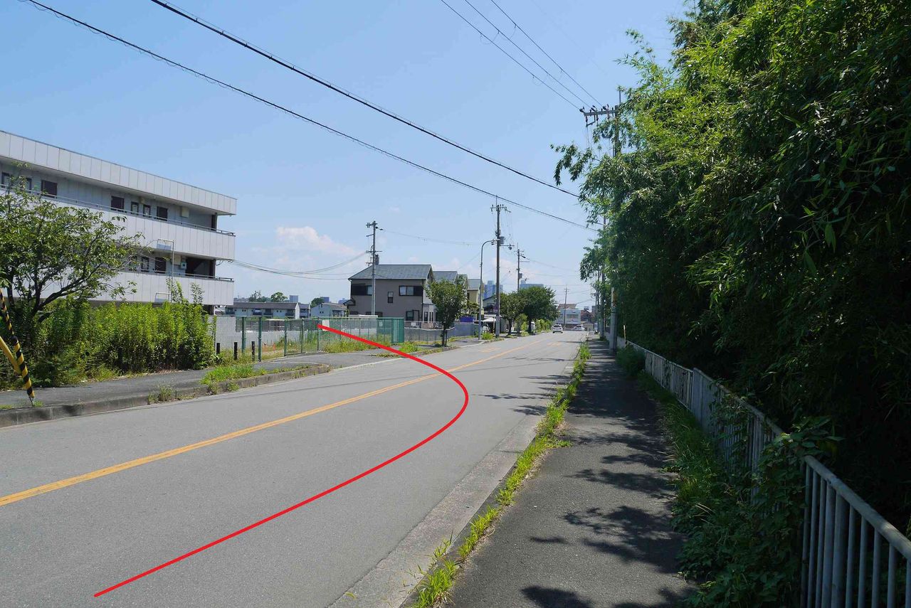 少し二中に向かって振り返るとルートはこんな感じ。芥川から鉄橋を通るといったんカーブが必要です。しかし郡家本町はこの付近、一段高いため川沿いのルートを進んだと考えられます。