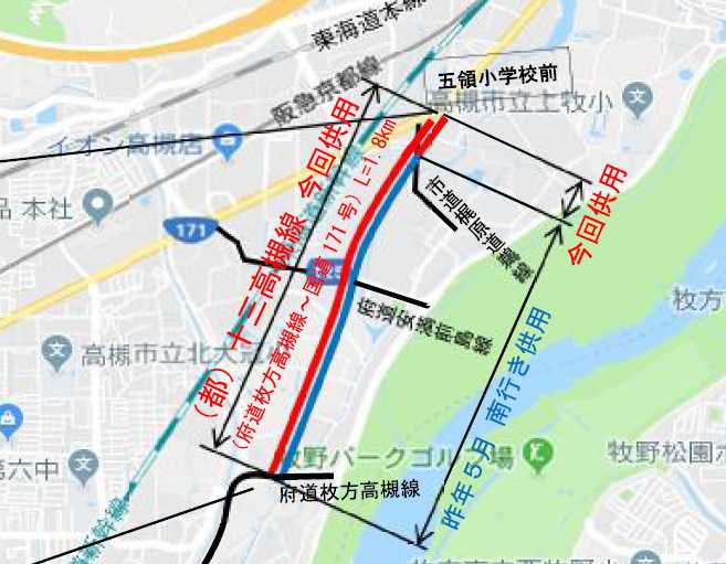 十三高槻線 171号線五領付近 井尻交差点から前島方面の道路が6月に南側一方方向で開通しましたが28日(木)14時に両面通行で、府道枚方高槻線(高槻市東天川5丁目)から国道171号(高槻市井尻1丁目)まで開通するみたいです。(情報ありがとうございます)