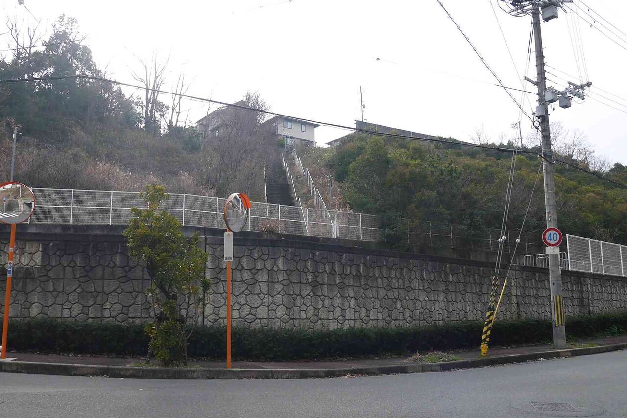 今回その15は、美しが丘1丁目と別所本町の間、高槻北高等学校の西側の名神高速道路沿いの道に降りる階段です。