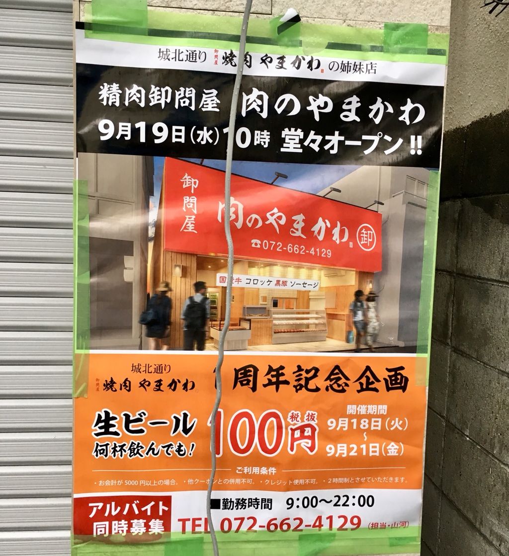 2018年09月08日 【お菓子の木の横】長きに渡って駐輪場だった敷地の跡地に「精肉屋 やまかわ」が開店するみたい【阪急近く】 阪急高槻市駅からほど近く、モリタ屋の筋の向かいの並びにありますお菓子の木高槻店の横に「肉のやまかわ」さんが開店予定です。精肉店です。貼り紙に9月19日10時オープンとあります。ちょうど1年前、城北通りにできた「焼肉 やまかわ」さんの姉妹店であります。名前が一緒です。高槻の駅近くで精肉店ってちょっと珍しいような気がしました。 去年、開店した「焼肉 やまかわ」の記事は、▶こちら 「ニュース」カテゴリの最新記事 タグ :#高槻中部#開店 < 前の記事次の記事 > コメント コメントフォーム 名前 コメント 評価する リセット リセット 顔 星 投稿する 情報を記憶