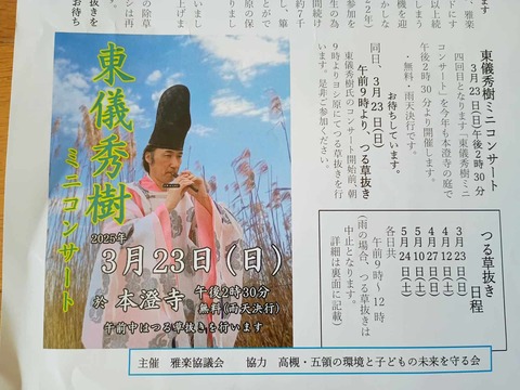 上牧の本澄寺 今年も23日に雅楽師の東儀秀樹氏が来られるよう ヨシの再生のためのボランティア活動は23日から 2025年3月