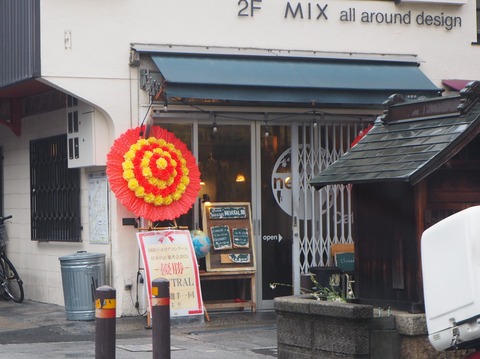城北町 パエリアサミット2025の優勝のニュートラルさん前にお祝いの看板をみかけた 20250年6月