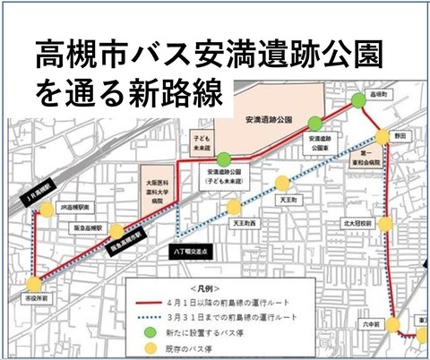 高槻市営バス 4月から前島行きのルートを一部変えた安満遺跡公園を通る新路線ができるみたい