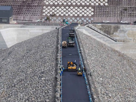 高槻のすぐ西側 安威川ダムのようす ついに堤体の通路が舗装された 沈下を確認されたもよう 2023年11月