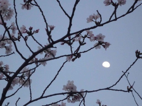 桜がすでに満開になってきた!夕方の月を入れて撮ってみた! 2018年