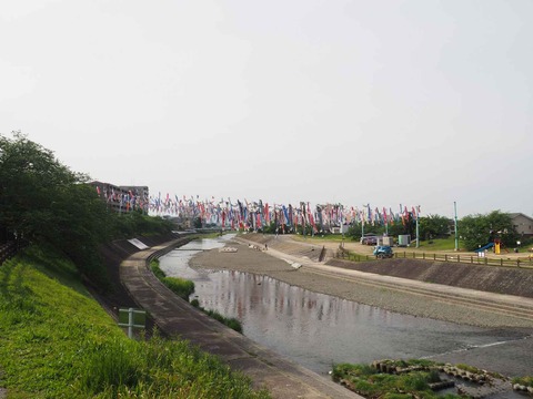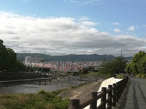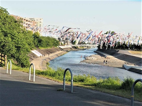 今日の芥川のこいのぼり 水量が収まった5月9日の夕方のようす