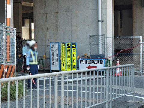大蔵司 芥川沿いの道路付近の名神高速橋脚の工事 明日2023年6月5日(月)10時に開通予定