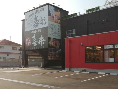 大蔵司3丁目 寿司のKIRAKU喜楽のお店に大きな看板ができてる 屋上にはバーべキューなどのビアガーデンも開店