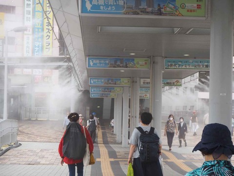暑くなってきた朝 JR高槻駅南側通路のミスト 2021年7月