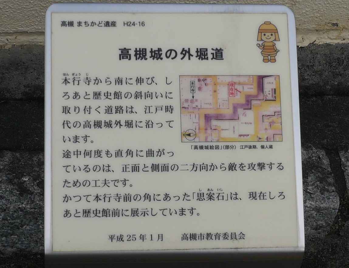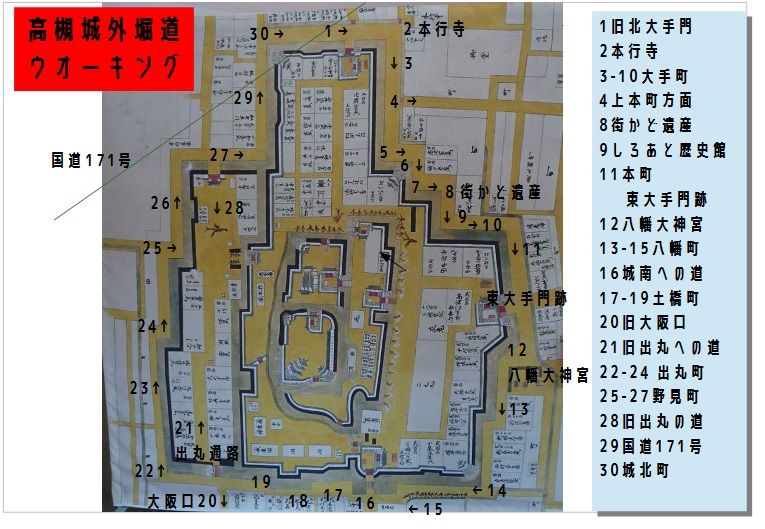 阪急から城北通りを通り171号線を越えて、北大手門跡(ドラッグストア付近)から時計回りです。高槻城の古絵図で数字の書いた順番に歩いてみます。