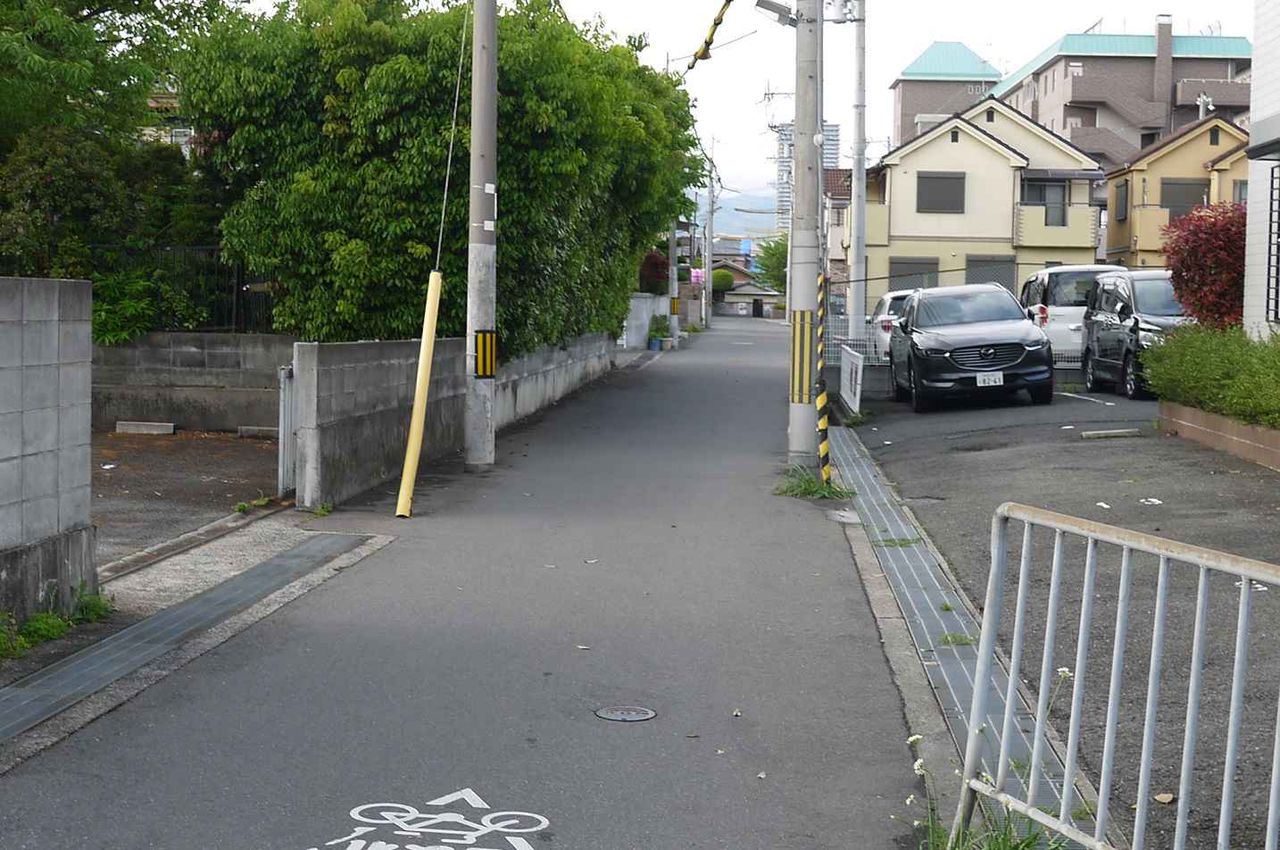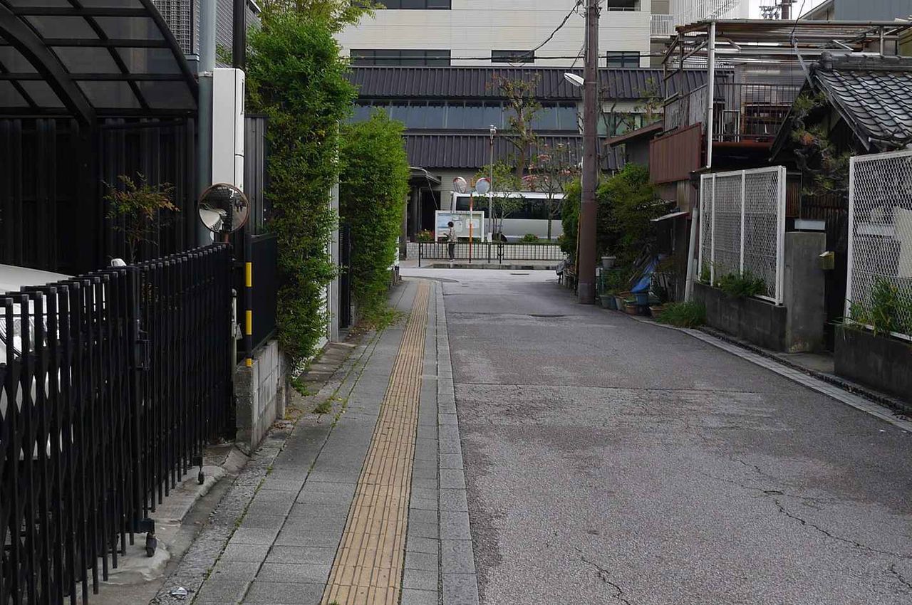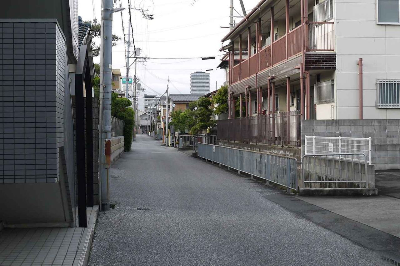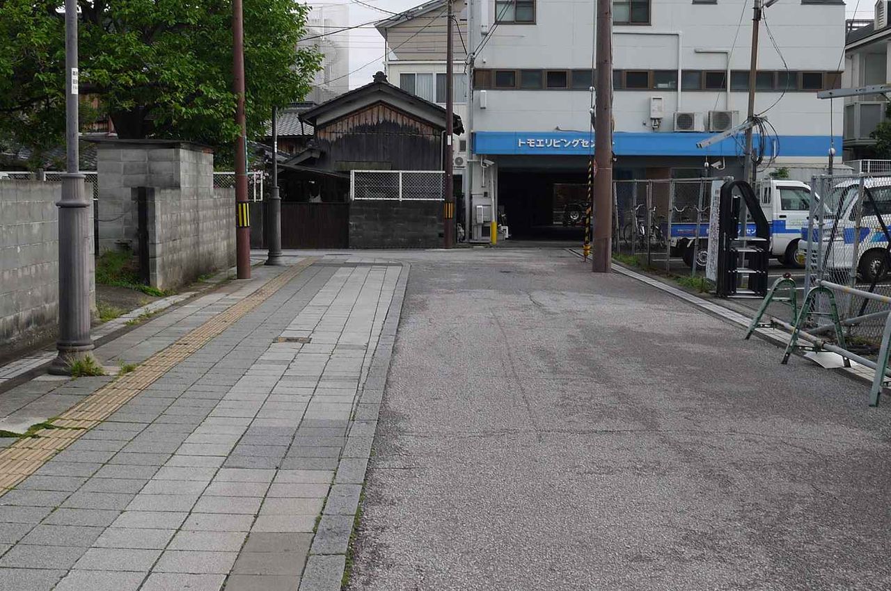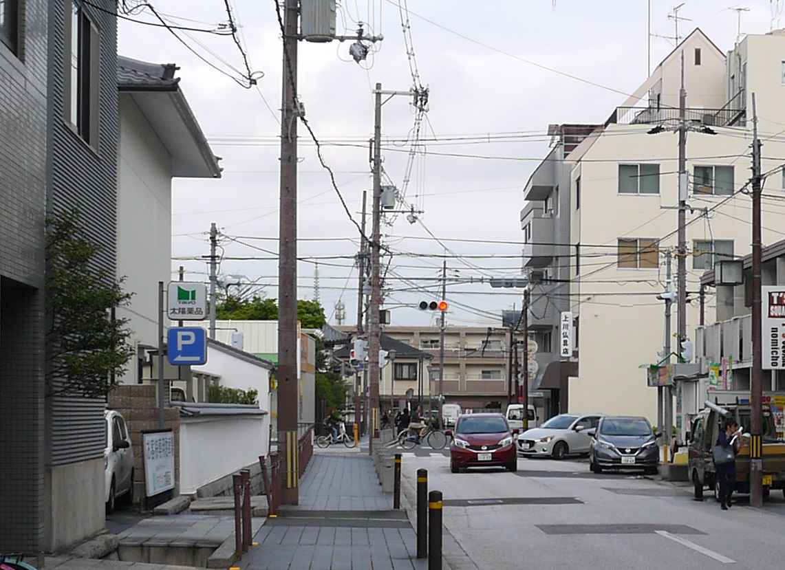 唯一城内の通路が残っているところ。後に建設された「出丸」のなかを南北に通っていた道を南側からながめたところ電柱の少し先くらいまではお堀だったと推測します。ここへは入らず、再び外堀道を歩きます。