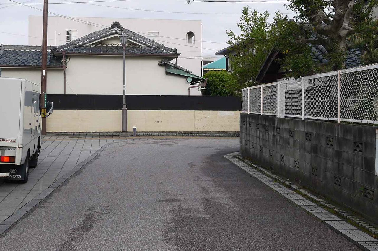 右側がお堀だったところ。この先3回右に曲がります。この直線は長いのですが、古絵図では1つめの直線はほかの直線と同様に描かれていて次に曲がる場所までの間で曲がっていたかもしれません。